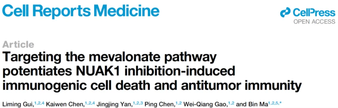 综上所述,本研究揭示了靶向甲羟戊酸途径与NUAK1抑制剂联合使用在癌症治疗中的潜力。通过抑制胆固醇合成,可以增强NUAK1抑制剂诱导的免疫原性细胞死亡,进而增强抗肿瘤免疫反应。这一发现为开发新的癌症联合治疗方案提供了理论基础,特别是在面对当前免疫检查点抑制剂和他汀类药物治疗效果有限的情况下。此外,本研究还为进一步探讨胆固醇在肿瘤免疫中的双重角色提供了新的视角,为未来临床前及临床研究提供了参考与指导建议。