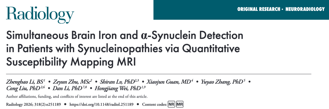 近日,免费av /磁共振诊疗高端技术国家工程研究中心的魏红江团队在国际权威杂志《Radiology》(中科院1区、IF=15.2分)上发表了最新研究成果:“Simultaneous Brain Iron and α-Synuclein Detection in Patients with Synucleinopathies via Quantitative Susceptibility Mapping MRI”。团队提出了一种亚体素定量磁化率成像(sub-voxel QSM,亚体素QSM)的新方法,首次实现了对突触核蛋白病患者脑内α-突触核蛋白聚集与铁沉积的同步、无创检测,并在区分帕金森病(PD)与多系统萎缩(MSA)方面表现出优异的诊断性能。有望基于MRI实现神经退行性疾病脑内蛋白分子病理级的精准定量。本研究得到了免费av 生命学院李丹教授团队及中科院上海有机化学所刘聪教授团队的大力支持。