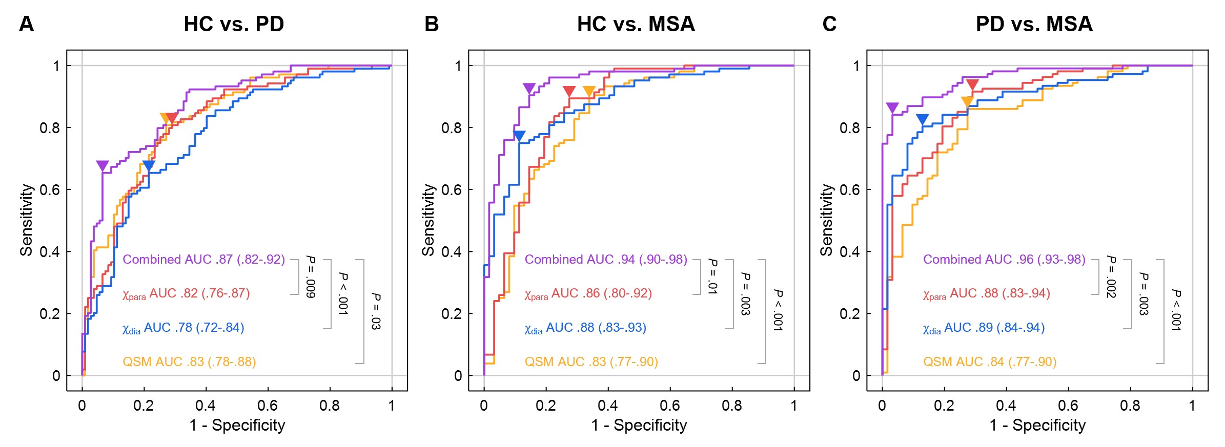 信号取得了0.94的AUC。在MSA与PD患者的区分中,χpara