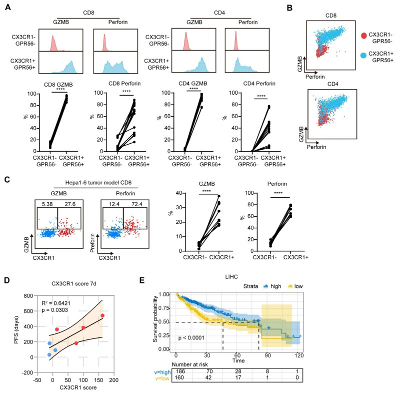 为深入探究多模态肿瘤治疗延长患者PFS的免疫学机制,通过对患者术前肿瘤组织、外周血,以及术后7天、30天外周血连续采样,结合单细胞转录组测序、单细胞TCR测序、流式细胞术等技术,全面刻画治疗前后的免疫景观动态变化;同时构建小鼠肝癌皮下肿瘤模型,验证关键免疫细胞亚群的功能与调控通路。研究发现,两组患者治疗前免疫景观无明显差异,而在治疗后,多模态肿瘤治疗组患者较RFA组患者树突状细胞成熟、NK细胞毒性分子表达、B细胞体液免疫应答上调,并诱导了CX3CR1+GPR56+ T细胞扩增,同时Tregs比例显著下调。结合动物模型研究证明,CX3CR1+GPR56+ T细胞高表达颗粒酶B、穿孔素、等效应细胞因子,并具有更强的向瘤内迁移的能力。治疗后7天CX3CR1评分与患者PFS呈正相关,提示多模态肿瘤治疗诱导的CX3CR1+GPR56+ 效应T细胞比例增加,是HCC患者良好临床预后的生物标志物。